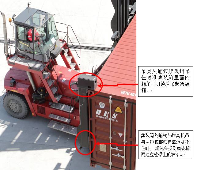 空箱堆高機(jī)在搬卸集裝箱時(shí),通過(guò)在堆高機(jī)吊具上面左右兩邊的旋鎖銷(xiāo)分別對(duì)準(zhǔn)集裝箱頂部靠近堆高機(jī)前端的左右兩邊的箱角,然后閉鎖之后再把集裝箱吊起,在吊起離地之后,集裝箱的前端很自然的就靠在堆高機(jī)吊具兩邊的底部鐵板上面。然后通過(guò)門(mén)架、吊具的升降、前傾、后傾、左右的側(cè)移、車(chē)輛的前后左右周?chē)苿?dòng)就可以完成空箱集裝箱的裝卸和搬運(yùn)。