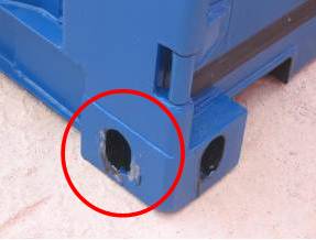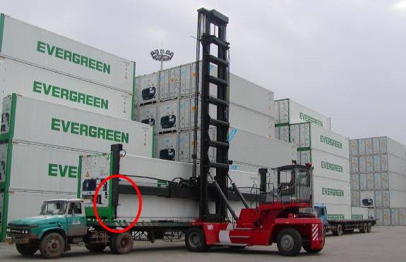 在上述起吊之后,集裝箱的前端與堆高機(jī)吊具兩邊底部鐵板靠近及托住時(shí),因搬卸時(shí)的碰撞、震動(dòng)等因素的影響,就難免會(huì)損傷集裝箱兩邊立柱梁上的油漆。如下圖二所示。