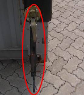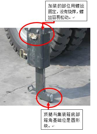 3)國(guó)外工廠可能出于對(duì)自己國(guó)外鋼材的信心,而沒(méi)有留意到國(guó)內(nèi)的集裝箱制造廠的產(chǎn)量和用量遠(yuǎn)遠(yuǎn)大于國(guó)外的工廠、司機(jī)操作不是很規(guī)范、場(chǎng)地的條件比較差。所以設(shè)計(jì)的頂腿的鋼材比較?。?0mm)、與臂內(nèi)的套口空隙大容易晃動(dòng),導(dǎo)致使用一段時(shí)間后,出現(xiàn)頂腿變形、輕微彎曲的情況。如圖六所示;