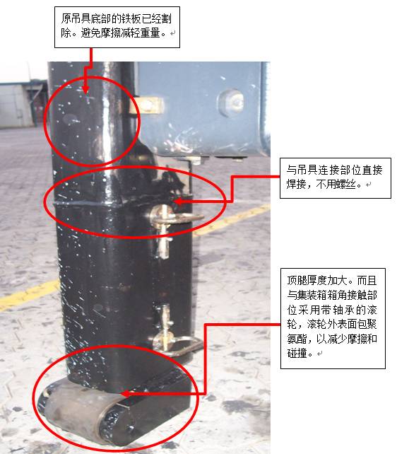 1)開(kāi)始,為避免或減少油漆的傷害,建議把吊具底端延長(zhǎng),把與集裝箱的接觸面從集裝箱的中部附近,轉(zhuǎn)移到比較隱蔽、而且強(qiáng)度比較高的部位:集裝箱的底部箱角;