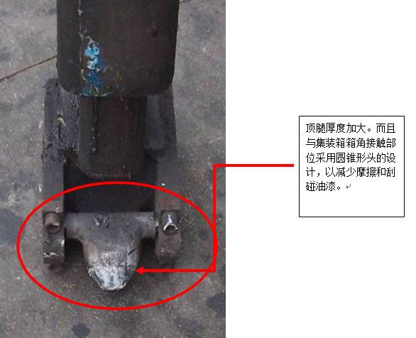 4)頂腿的前端與集裝箱下箱角接觸的部位是一個(gè)圓形塊,使用時(shí)底部箱角的油漆會(huì)出現(xiàn)比較明顯的摩擦痕跡。如圖五和圖七所示。