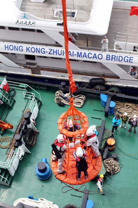 “振華30”停在大嶼山錨地,進(jìn)行最終接頭起吊前的試驗準(zhǔn)備工作