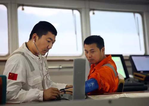 zpmc為船員們測量血壓,確保船員們的身體健康