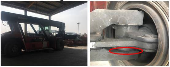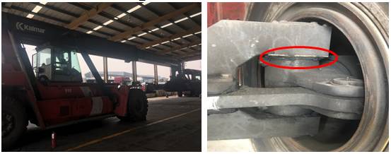 此時(shí)加注左右兩側(cè)轉(zhuǎn)向節(jié)下部滑動(dòng)圓形軸承。在加注潤滑脂的時(shí)候,檢查被擠出的舊潤滑脂上是否有比較大量的金屬屑,如有建議安排停機(jī)維修更換滑動(dòng)圓形軸承。如潤滑脂從后橋座與方形軸承之間溢出,也為不正?,F(xiàn)象,需檢查后橋座。關(guān)于輪軸上下軸承間隙標(biāo)準(zhǔn)請(qǐng)參考卡爾瑪維護(hù)手冊UDRF03.03GB(或UDRT02_03GB)6.2.2 輪軸。