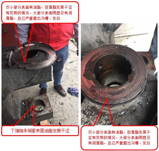 下列圖片我們可以看到轉(zhuǎn)向節(jié)上端的滑動(dòng)圓形軸承及方形軸承已嚴(yán)重磨損,只有一小部分的表面存在油脂,但是潤滑脂發(fā)黑干澀有變質(zhì)的情況,大部分表面明顯沒有潤滑脂,且已嚴(yán)重磨損、發(fā)白、磨出溝槽。轉(zhuǎn)向節(jié)下端的銅套軸承表面潤滑脂干澀。這樣的損壞明顯是由于潤滑周期偏長或者潤滑不到位造成的潤滑不足導(dǎo)致的。所以日常維護(hù)及檢查是保證設(shè)備長期使用壽命的必要步驟。