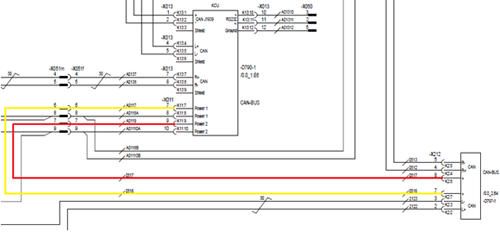 1)查詢機車故障代碼表,101、102為KCU 主控制器至KDU797-1控制器K2:7及K2:8的兩路冗余電源異常。參考如上圖機車電氣圖紙,檢查機車KCU至KDU797-1冗余電源之間的連接情況,(即:KCU:X011接頭,X051.6/X051.7插頭,KDU797-1:X212插頭均未見異常。)檢查兩條冗余電纜線的情況,也未發(fā)現(xiàn)短路、開路及阻值異常情況。用萬用表和試燈在X051.6/X051.7處測量,打開啟動鑰匙后,此兩處正常有電壓+24.6V(試燈亮度正常),說明KCU輸出至KCU797-1的冗余電源正常;