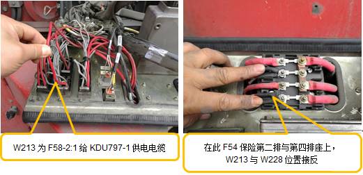 2)對著電氣圖,檢查發(fā)現(xiàn)在接通主電源開關(guān)S144后,F(xiàn)58-2:1這個給KDU797-1控制器的保險絲就有電+24.6V。而實際上這路電源是需要打開駕駛室啟動鑰匙開關(guān),經(jīng)過K315-1繼電器吸合后的點火電源。繼續(xù)檢查發(fā)現(xiàn):電氣盒接線中W213與W228電纜接線有錯。(W213為KDU797-1供電電源線應(yīng)接于F54-4點火電源,而實際被錯誤的接在F54-2,F(xiàn)54-2這個是電瓶電源;W228應(yīng)該接F54-2,而被接在F54-4,如下面照片)這樣W213電纜在接通主電源開關(guān)后就處于一直得電狀態(tài)。W228屬于OPT選裝的電源,因機車未安裝選裝件,故這路電源沒有故障指示。重新接駁電纜,發(fā)現(xiàn)機車故障代碼消失,至此機車故障得以徹底解決。