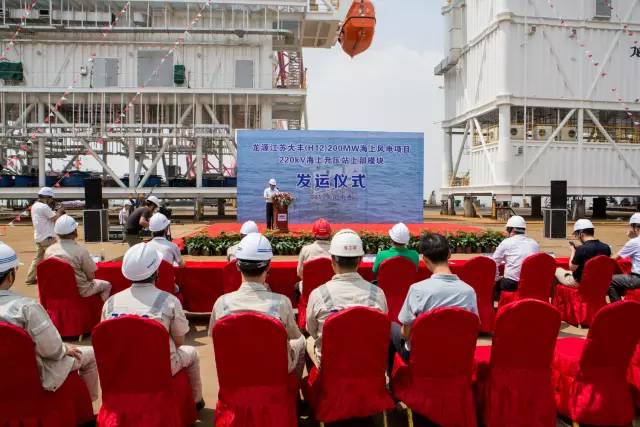 6月8日上午,振華重工舉行龍?jiān)唇K大豐(H12)200兆瓦海上風(fēng)電場(chǎng)項(xiàng)目220千伏海上升壓站上部模塊發(fā)運(yùn)儀式。