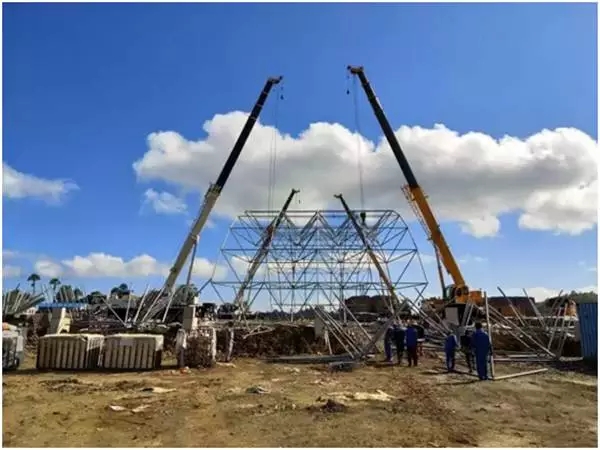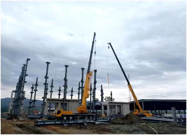 印度尼西亞卡巴那島,4臺(tái)徐工QY25K5-I汽車(chē)起重機(jī)在鎳還原項(xiàng)目二期原料庫(kù)進(jìn)行網(wǎng)架主體安裝協(xié)同吊裝。