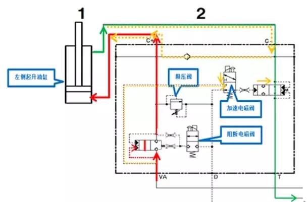 2. 當(dāng)?shù)醣墼谧銎鹕齽?dòng)作時(shí),VA口為供油首先推動(dòng)二通道單向控制閥的閥芯,使其導(dǎo)通至油缸C+口,(此時(shí)阻斷電磁閥為失電狀態(tài))。油缸C-口則通過(guò)二通道單向控制閥(此時(shí)閥芯為導(dǎo)通位置)為回油至回油T口來(lái)實(shí)現(xiàn)起升的動(dòng)作,如下圖:(圖示中紅色為供油,綠色為回油)