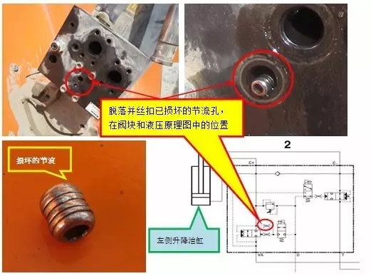 4. 現(xiàn)場(chǎng)拆解了左側(cè)阻斷閥,對(duì)閥塊進(jìn)行檢查,果然發(fā)現(xiàn)閥塊上的一個(gè)節(jié)流孔已退扣脫落,同時(shí)節(jié)流孔的絲扣已損壞,如下圖紅圈所示: