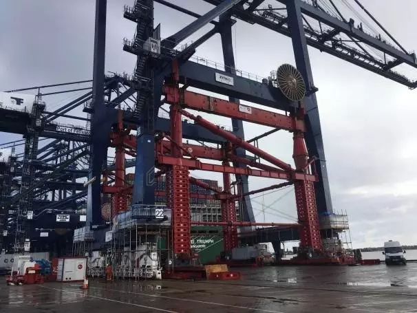 9月15日,振華重工完成英國(guó)菲利斯通碼頭10臺(tái)岸橋加高項(xiàng)目的首臺(tái)設(shè)備頂升,并于9月17日完成門腿加高段全部安裝。