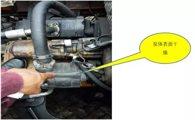 根據(jù)客戶反映的情況,首先從最簡單的進(jìn)行檢查,啟動機(jī)車。由于當(dāng)前吊具旋鎖未完全解鎖,起升是無動作的,所以暫無法測試出大泵起升的最大壓力值,然后測試小泵的壓力在加大油門時壓力表讀數(shù)最大值:130bar至135bar壓力之間,顯然低于機(jī)車銘牌規(guī)定的195bar壓力。在檢查的同時偶然發(fā)現(xiàn)一個非常重要的現(xiàn)象:小泵的泵體表面很干燥,觸摸表面有發(fā)燙的感覺,而大泵表面有少量的油漬,暫沒有發(fā)燙的感覺。因為當(dāng)前吊具旋鎖連鎖的保護(hù)未有起升動作,通常液壓泵泵體表面有少量油漬屬正?,F(xiàn)象,而泵體表面干燥溫度偏高說明泵有異常,初步確定小泵工作異常而建立不起泵壓力。