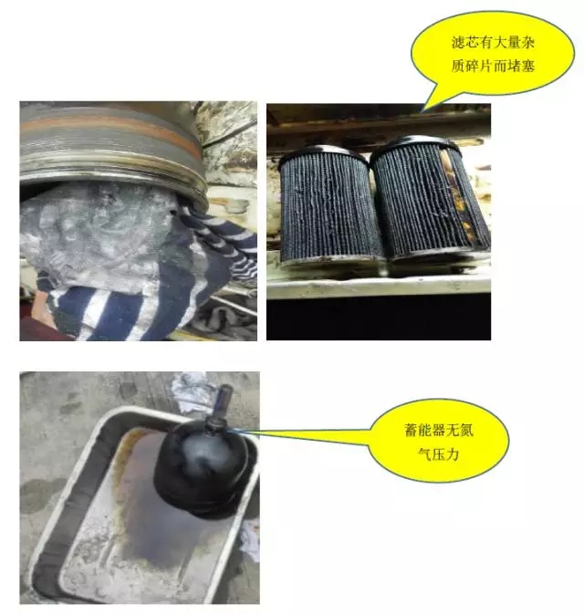 4.拆解蓄能器檢查發(fā)現(xiàn)無氮?dú)鈮毫Γ幸簤河土鞒觯⑶矣唾|(zhì)渾濁。