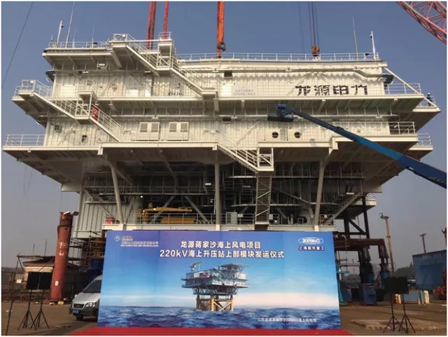 11月3日,振華重工為海安龍?jiān)春I巷L(fēng)力發(fā)電有限公司建造的“龍?jiān)唇K蔣家沙300MW海上風(fēng)電項(xiàng)目220kv海上升壓站上部模塊”在長(zhǎng)興分公司舉行發(fā)運(yùn)儀式。振華重工副總裁周崎,海安龍?jiān)春I巷L(fēng)力發(fā)電有限公司副總經(jīng)理唐永衛(wèi)出席并發(fā)表致辭。