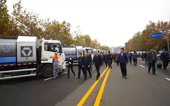 11月17日,全國城市管理工作現(xiàn)場會暨城市執(zhí)法體制改革推進(jìn)會期間,住建部倪虹副部長、徐州市周鐵根市長和其他與會嘉賓檢閱徐工多功能抑塵車陣列