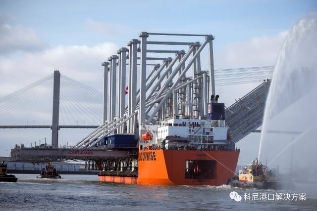 2017年11月22日清晨,薩凡納河上的拖船駛向大海,迎接載著四臺大型科尼岸橋的重吊船天鵝號。這些新巴拿馬型起重機的高度足以提升碼頭上方152英尺的集裝箱。每臺岸橋的起重能力為72噸。目前前大梁端部距離碼頭表面192英尺。隨著前大梁提升安裝到最終位置并俯仰,岸橋?qū)⑦_到412英尺高。新的起重機將使薩凡納的岸橋數(shù)量增加到30臺。另外6臺科尼岸橋?qū)⒃?020年到達。當(dāng)所有岸橋交付后,此次升級將使得美國最大的單一集裝箱碼頭每小時裝卸近1300個集裝箱。