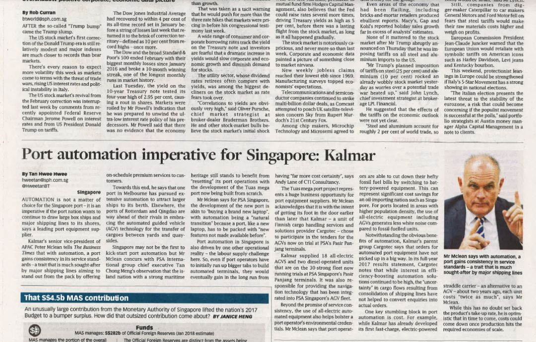卡爾瑪亞太區(qū)高級副總裁麥立德先生(Peter McLean)接受了新加坡商業(yè)時報(The Business Times)的專訪并對新加坡港口自動化的發(fā)展發(fā)表了獨特見解。