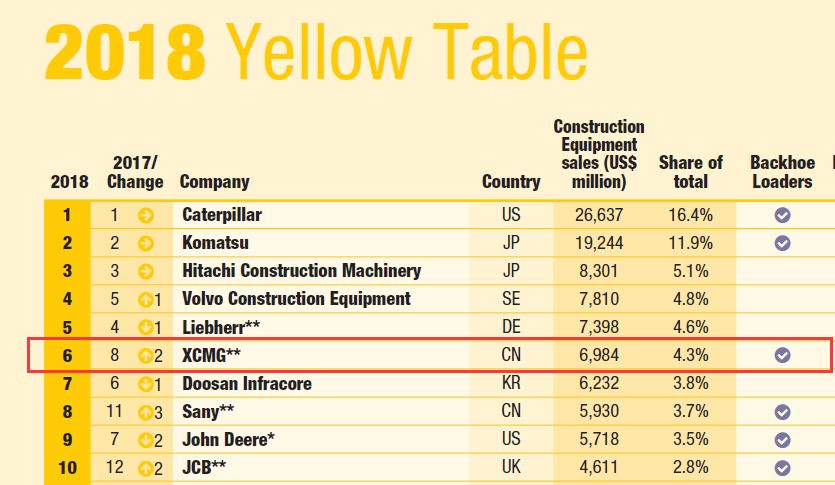 近日, 世界領(lǐng)先的工程機(jī)械信息提供商——英國KHL推出2018年全球工程機(jī)械制造商50強(qiáng)排行榜(Yellow Table2018)權(quán)威發(fā)布。卡特彼勒依然占據(jù)榜首,讓中國工程機(jī)械行業(yè)振奮的是,此次全球工程機(jī)械50強(qiáng)榜單前十強(qiáng)中有兩家中國工程機(jī)械企業(yè)上榜,徐工集團(tuán)XCMG從第八位上升到了第六位,中資企業(yè)排名第一,成為連續(xù)數(shù)年躋身全球前十強(qiáng)的中國企業(yè)。