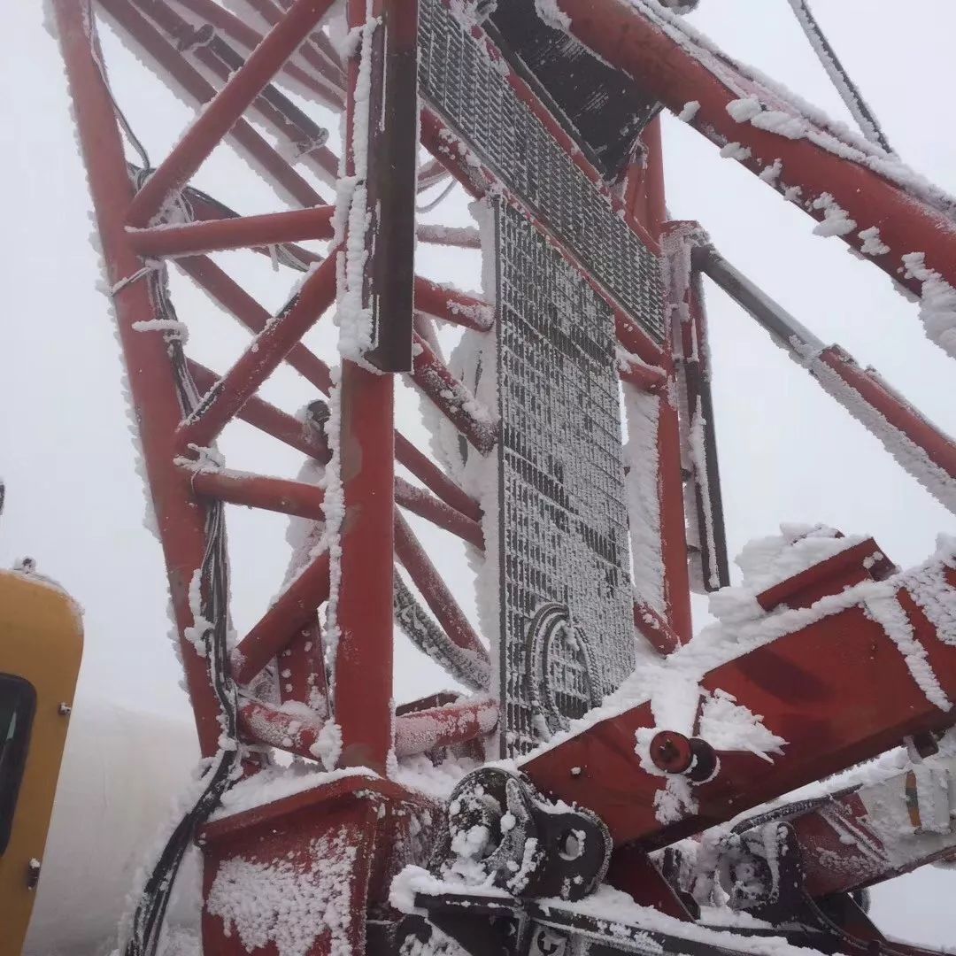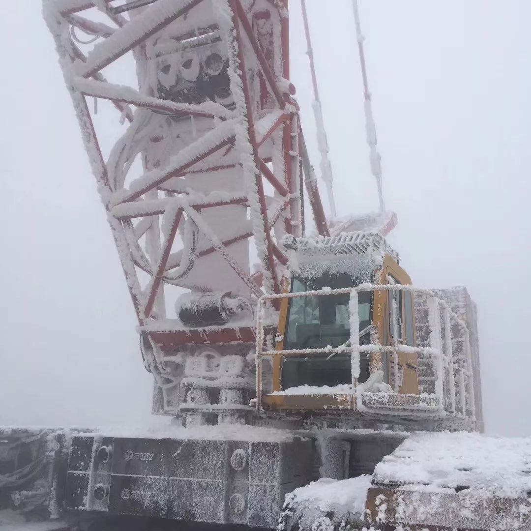 在海拔3600米的地方工作不是一件容易的事,尤其是整個工期大部分都處于冬季,更讓施工難上加難。這里最低溫可以達(dá)到零下25℃,最大風(fēng)速達(dá)到25米/秒,風(fēng)一吹過,整個履帶起重機(jī)就會被裹上一層厚厚的白色外衣,20厘米的冰層一點(diǎn)都不稀奇。再加上山上多霧,抬頭望去,高大的吊臂很快就隱藏在了濃濃的霧里。