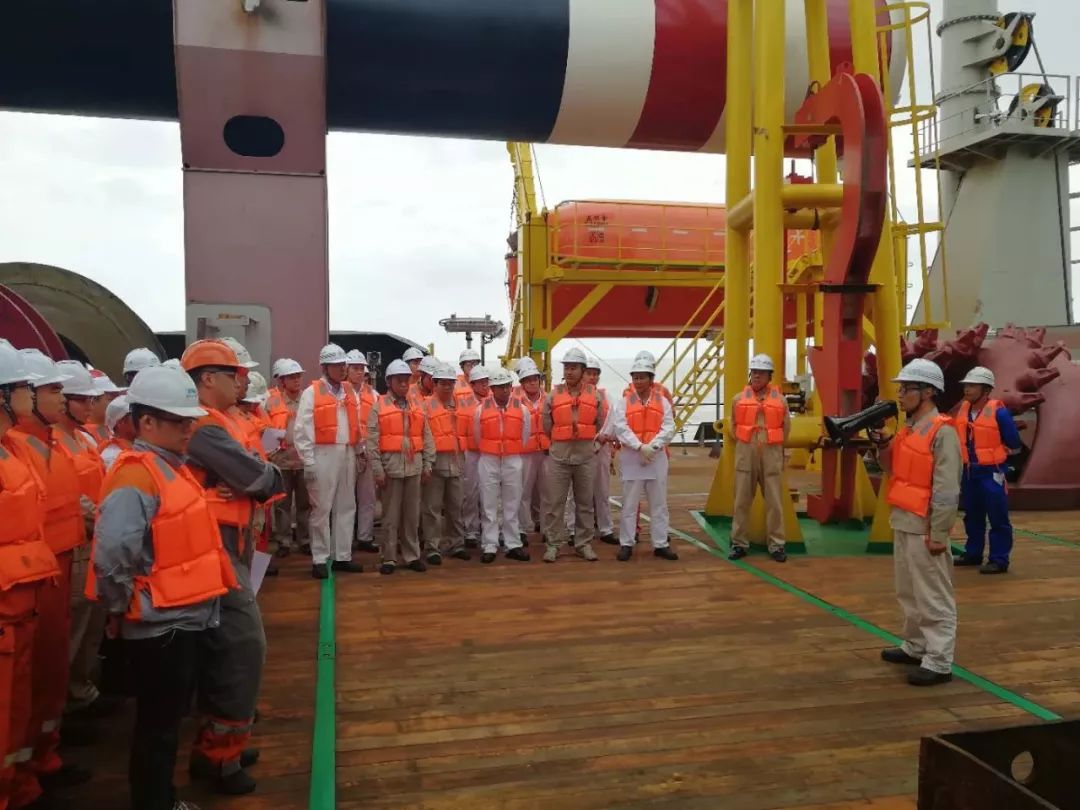 ? 出航前 “天鯤號”項(xiàng)目總指揮、啟東海洋工程公司副總經(jīng)理陳新華組織全體試航人員進(jìn)行消防救生演習(xí),告知全體成員應(yīng)急信號,明確安全小組長,確保試航期間人員和設(shè)備安全。