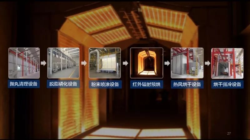 與積放式輸送系統(tǒng)聯(lián)控,實(shí)現(xiàn)自動(dòng)化拋丸、水淋清理、靜電粉末噴涂、自動(dòng)化烘干、強(qiáng)冷等功能,是行業(yè)內(nèi)首條大結(jié)構(gòu)件粉末靜電噴涂生產(chǎn)線。