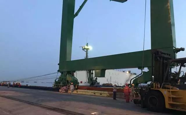 電影《敦刻爾克》大撤退的一幕還在眼前,振華重工卸船團隊就在敦刻爾克碼頭與潮差展開了一場激烈的“戰(zhàn)斗”?!罢袢A24”輪運載著1臺法國用戶的岸橋和2臺荷蘭用戶的岸橋,還未抵達敦刻爾克碼頭,用戶便給出離泊時間為6月11日中午12點,若無法按時離開,則必須延后靠船時間。為保證設(shè)備的按時交付,卸船小組決定在1小時內(nèi)完成卸船任務(wù)。6月10日,敦刻爾克碼頭潮差將近8米,大潮差對于卸船時間要求緊迫,不容有失。雪上加霜的是該項目岸橋的海、陸側(cè)有兩條軌道不在一條直線上,整個卸船過程僅有1小時的時間,還需要花費近半個小時調(diào)整軌道。這陡然增加了卸船難度,更何況整個過程不得有一絲差池。卸船船隊經(jīng)過精密的計劃,制定以半小時為單位的卸船方案,船、岸人員各司其職,緊張有序地把岸橋安全卸至碼頭,最終僅僅用了50分鐘便完成卸船任務(wù),受到用戶及監(jiān)理一致贊譽。