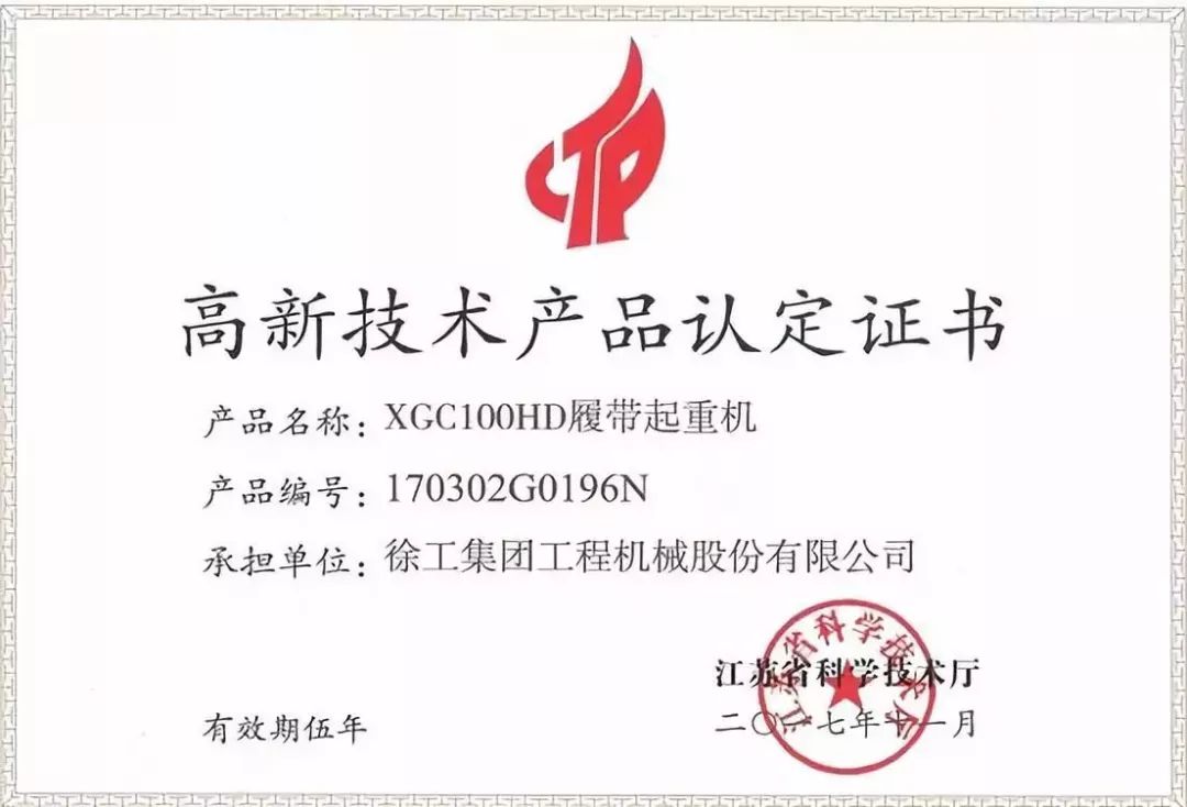近日,徐工XGC100HD多功能履帶起重機(jī)順利通過(guò)江蘇省科學(xué)技術(shù)廳認(rèn)定,榮獲江蘇省高新技術(shù)產(chǎn)品榮譽(yù)稱號(hào)。