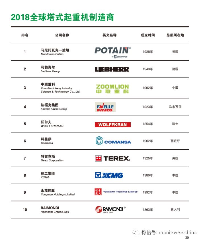 由中國工程機械雜志近日發(fā)布的全球起重機行業(yè)重量級排名榜單中,波坦獲得了“2018全球塔式起重機制造商”第一名。同時,馬尼托瓦克亦獲得了“2018全球起重機制造商”第三名。