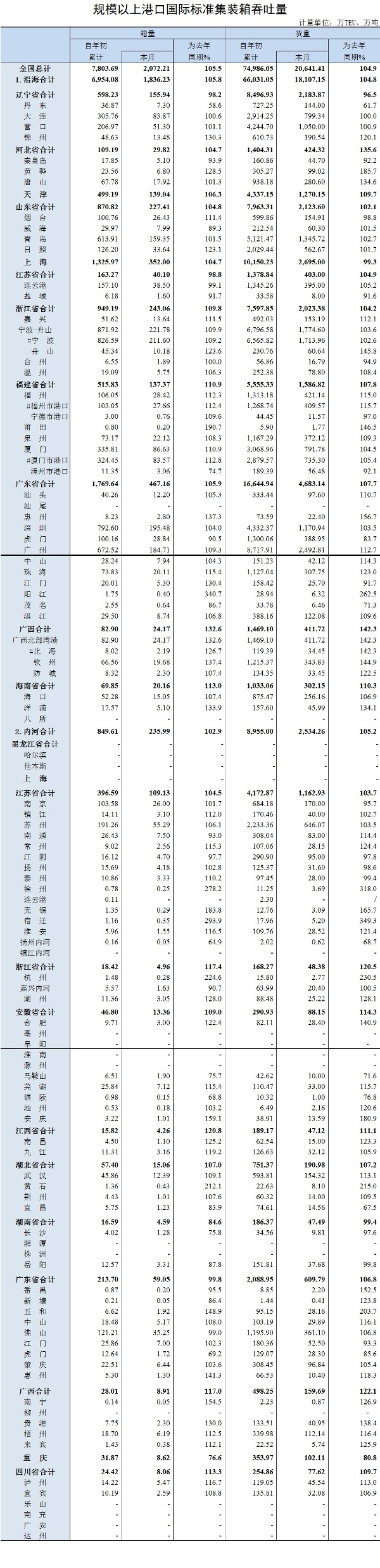 9月全國港口貨物吞吐量為10.5億噸,同比上漲6.8%;全國港口外貿貨物吞吐量3.3億噸,同比增長7.3%;全國港口集裝箱吞吐量2063.92萬TEU,...