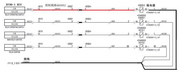 現(xiàn)場維修人員查閱DRT450正面吊的維修手冊故障代碼表,65#故障代碼解釋為:因電氣線路的短路或斷路,駕駛室主控制器KCU保護(hù)電路自動切斷K3009-2繼電器的控制電源,導(dǎo)致供應(yīng)吊具KDU的緊急電源F58-3保險(xiǎn)組失電,吊具無動作。此部分的電氣原理圖如下: