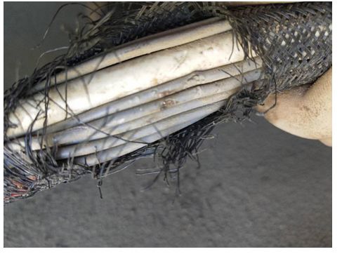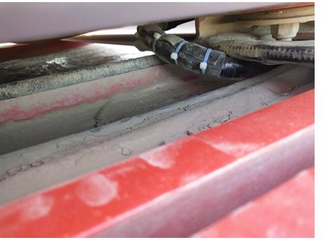 維修人員根據(jù)電氣原理圖檢查K3009-2繼電器控制線路A01012,測得報(bào)出現(xiàn)故障報(bào)警后的線路無電壓,繼電器未吸合,檢查對地電阻無異常。維修人員在消除65#報(bào)警重啟后重新檢查,測得線路電壓正常,為24伏。維修人員繼續(xù)檢查線路K3009-2線圈插頭到駕駛室D790-1的K10:12插腳之間電纜,發(fā)現(xiàn)駕駛室底部與線束拖鏈位置摩擦破損,如下圖: