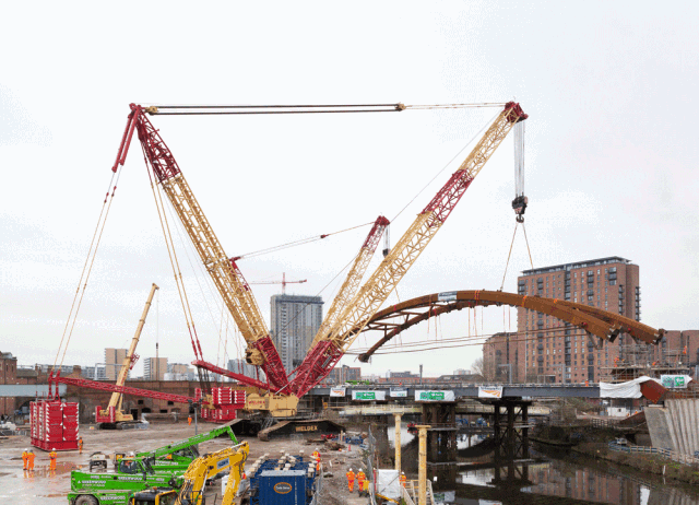 2016年7月,LR 1750開(kāi)始了在曼徹斯特工作。750噸起重機(jī)花費(fèi)了6個(gè)月的時(shí)間在河上快速搭建了橋梁的下部并安裝了90米的橋拱。這塊巨大的鋼結(jié)構(gòu)先前已被分段運(yùn)送到城市中心地區(qū)。