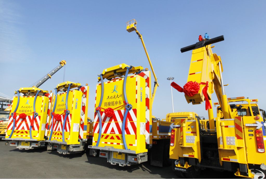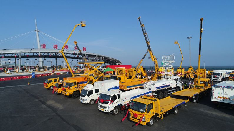 2018年4月,來自徐工的6臺(tái)防撞緩沖車、2臺(tái)高空作業(yè)車、2臺(tái)大噸位清障車、2臺(tái)道路洗掃車、1臺(tái)隨車起重機(jī)及1臺(tái)小型裝載機(jī)等高端成套化裝備整齊排列,與壯美的港珠澳大橋交相輝映,形成一道靚麗的風(fēng)景線。