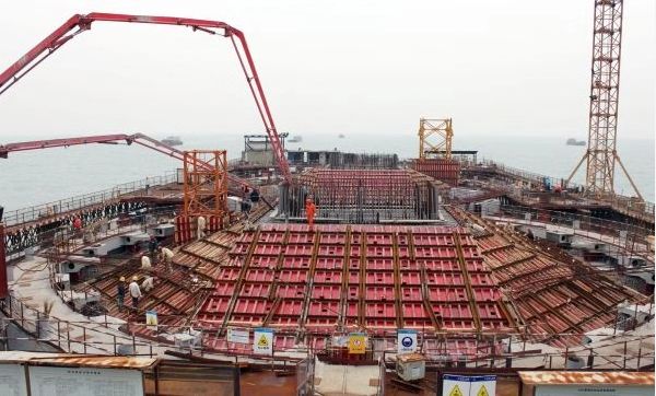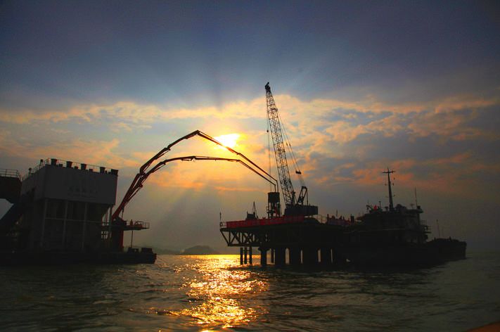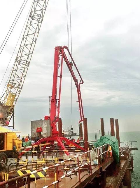 島隧工程是大橋的控制性難題。中交港航局承建了島遂建設(shè)聯(lián)合體工程,該島隧工程包括一條特大型沉管隧道、兩個(gè)深海人工島,三一提供了12臺(tái)拖泵、12臺(tái)布料桿、10臺(tái)攪拌車以及1個(gè)攪拌站參與建設(shè)。其中西人工島三一提供了1臺(tái)18米布料桿。