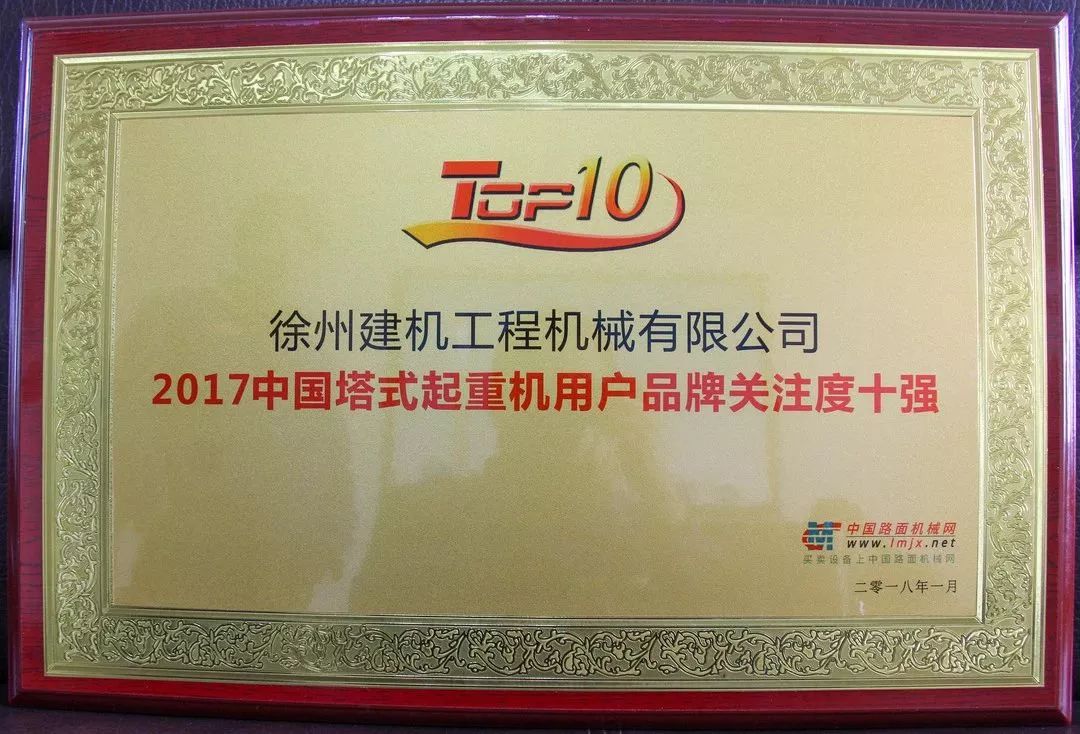 徐工塔機(jī)榮獲2017年度中國塔式起重機(jī)用戶品牌關(guān)注度十強(qiáng)