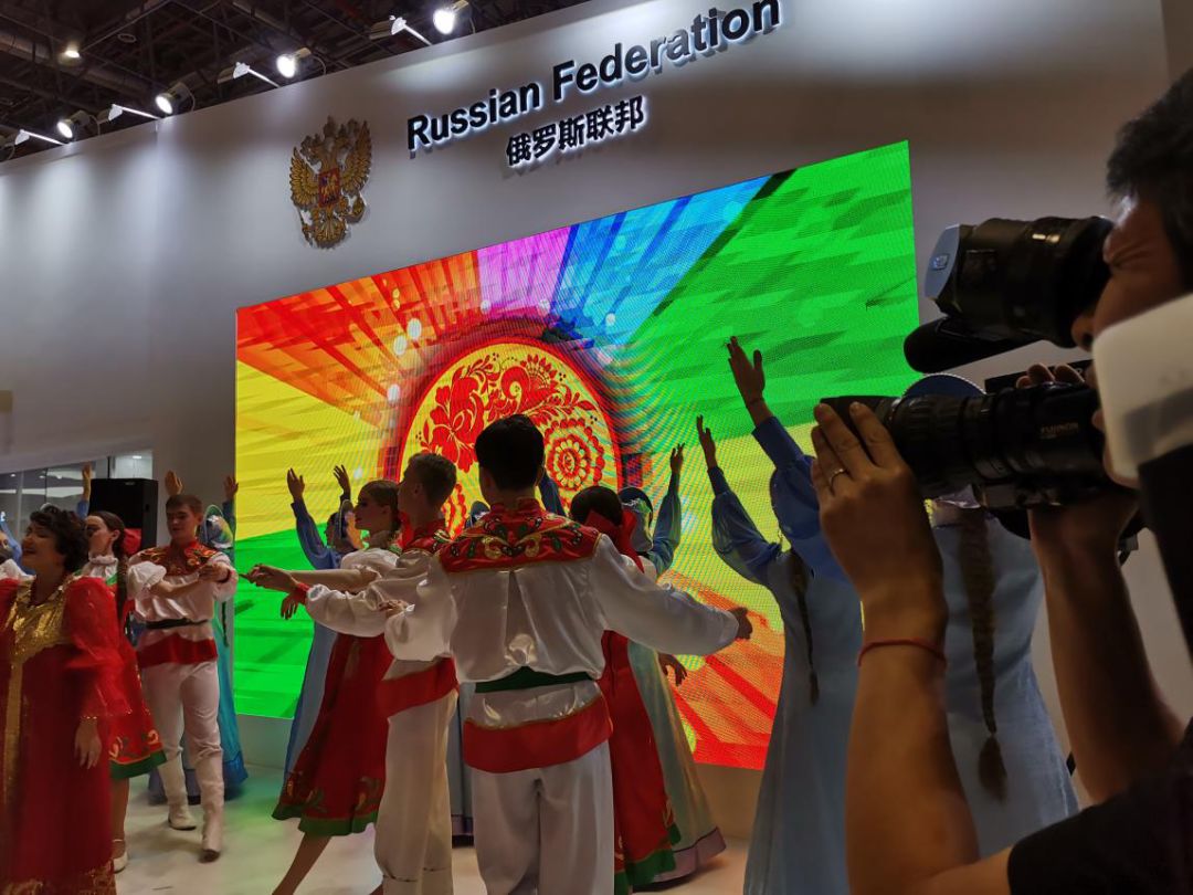 在國(guó)家展展館中,來(lái)自俄羅斯的姑娘和小伙子們帶來(lái)了歌舞表演,廣大中國(guó)觀眾熟知的《莫斯科郊外的晚上》將現(xiàn)場(chǎng)氛圍推向高潮。