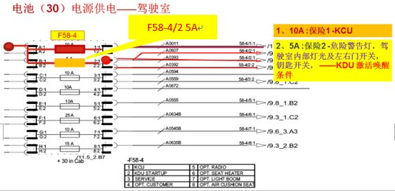維修人員首先檢查F58-1相關(guān)保險絲是否正常,發(fā)現(xiàn)繼電器K315-1無吸合。繼電器K315-1是負(fù)責(zé)設(shè)備整體送電的主繼電器,如果沒吸合,就會出現(xiàn)顯示屏不亮,設(shè)備沒有工作電源的情況。保險組F58-1的各個保險電路圖如下:其中第一個保險30A送電至駕駛室的F58-4后再繼續(xù)為主電腦KCU提供控制電源。