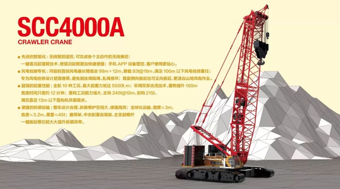 履帶起重機(jī)則是今年名躁四方的“山地風(fēng)電檢修王”SCC4000A,以及SCC1000A和最具用途的80噸伸縮臂SCC800TB。
