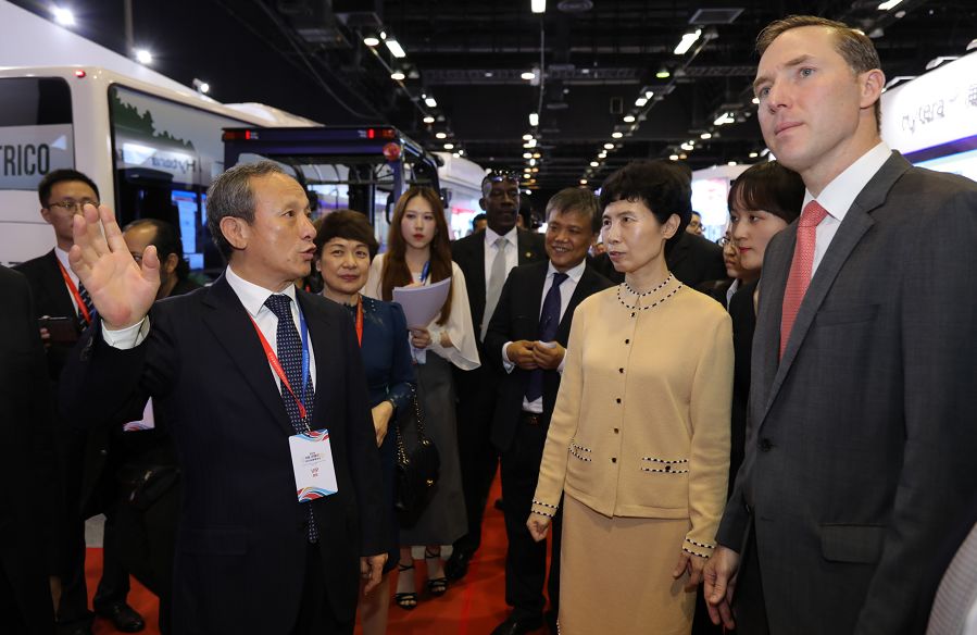 王民董事長為中國貿(mào)促會會長高燕女士、巴拿馬工商部部長奧古斯托·阿羅塞梅納先生介紹徐工參展情況