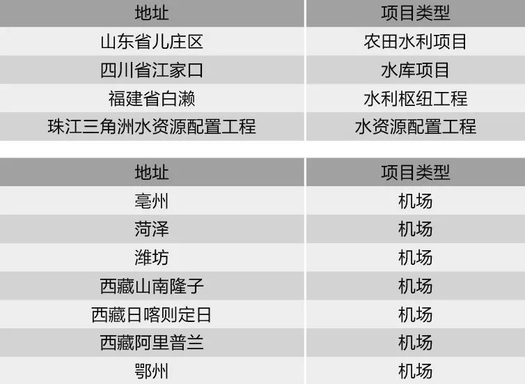 2019年計(jì)劃開工大型機(jī)場有毫州機(jī)場、菏澤機(jī)場、濰坊機(jī)場、鄂州機(jī)場等;計(jì)劃開工水利項(xiàng)目有臺兒莊農(nóng)田水利項(xiàng)目、江家口水庫項(xiàng)目、白瀨水利項(xiàng)目等。