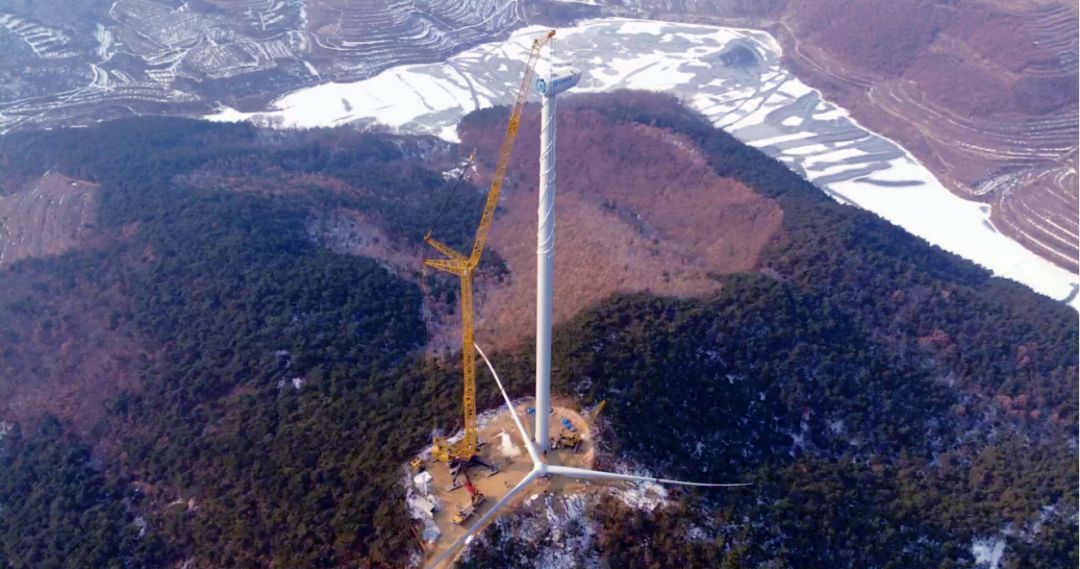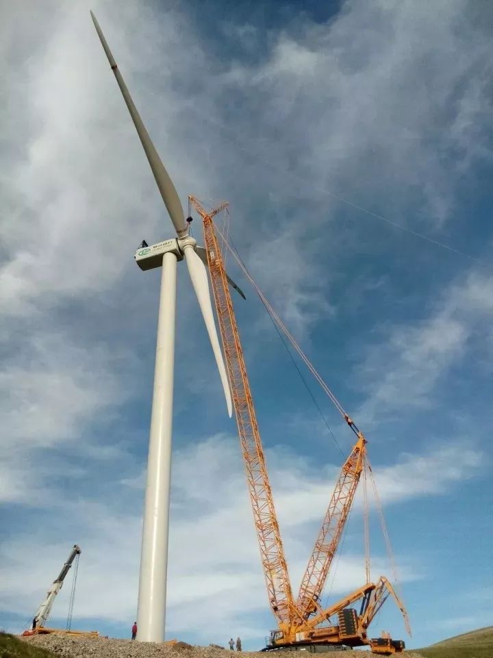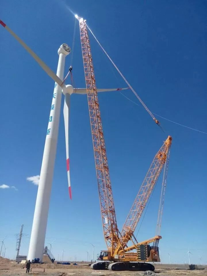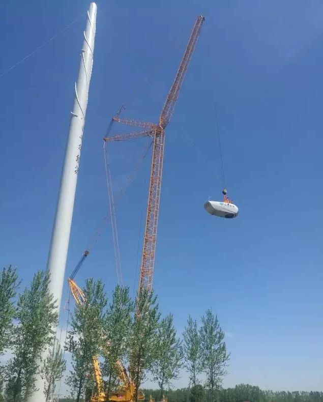 2017年河南蘭考某風(fēng)場(chǎng),徐工1250噸級(jí)的XGC16000履帶起重機(jī)將一臺(tái)遠(yuǎn)景2.2MW風(fēng)機(jī)機(jī)艙成功吊裝至140米高的塔筒上。