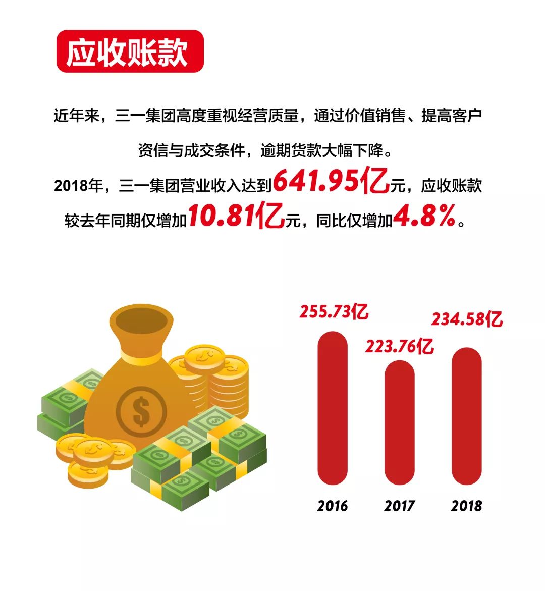 根據(jù)2018年年度財務(wù)報告,三一集團2018年實現(xiàn)營業(yè)收入641.95億元,同比增長44.30%;利潤總額68.57億元,同比增長161.45%;經(jīng)營現(xiàn)金流凈額105.69億元,同比增長16.99%。2018年公司各項經(jīng)營能力建設(shè)取得積極進展,各項能力指標(biāo)取得顯著進步,經(jīng)營業(yè)績創(chuàng)歷史最優(yōu)。