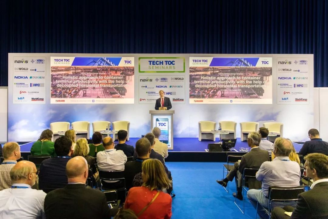 卡爾瑪碼頭設(shè)計服務副總裁Timo Alho先生在自動化會議第2部分發(fā)表題為 “借助解耦式水平運輸實現(xiàn)集裝箱碼頭生產(chǎn)效率的綜合方法 ”的演講。