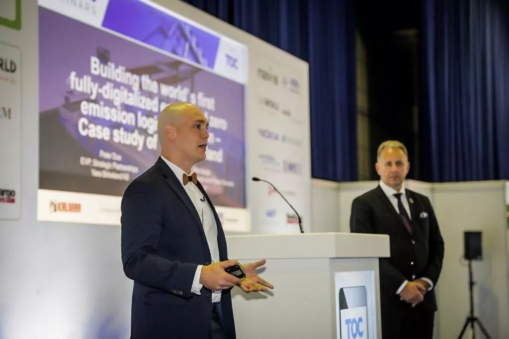 卡爾瑪產(chǎn)品組合經(jīng)理Mette Kjems-B?rentzen和Cabooter集團業(yè)務發(fā)展與卓越運營部門的Peter Pardoel發(fā)表題為”卡爾瑪促進貨物裝卸行業(yè)生態(tài)效益“的演講。