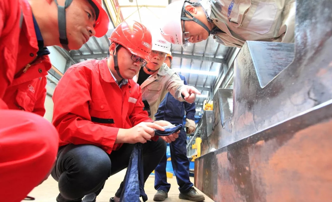 高溫下,探傷人員全副武裝,硬度檢測人員登上爬下,焊接人員擦著汗水,船東代表、船檢和檢驗(yàn)主管也在不斷溝通和忙碌,多少人早已全身濕透。