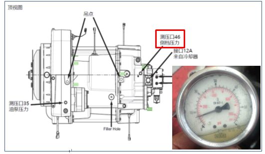 機車的故障現(xiàn)象顯示只有在倒檔時才出現(xiàn)油壓低的故障代碼,而在前進檔時工作是正常的,可以初步判斷變速箱系統(tǒng)壓力正常,排除壓力傳感器故障;為進一步確認系統(tǒng)壓力情況,維修人員現(xiàn)場使用外接壓力表測量了變速箱系統(tǒng)壓力,顯示發(fā)動機怠速時變速箱系統(tǒng)壓力為26bar,最高轉(zhuǎn)速時為28bar,在正常范圍內(nèi)。