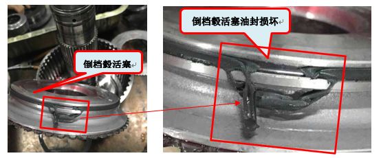 在排除完變速箱所有外圍可能原因后,可判斷該機車故障原因發(fā)生在變速箱內(nèi)部倒檔轂壓力泄漏。進一步拆解變速箱,發(fā)現(xiàn)倒檔轂活塞油封損壞,其它部件正常;