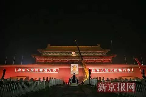 一旁的起重機吊臂再次抬起,穩(wěn)穩(wěn)地鉤住停放在貨車上的新畫像的頂端,將畫像懸起,并向天安門城樓的中央靠近。整個過程,畫像穩(wěn)穩(wěn)當當。1小時后,新繪毛主席畫像被懸掛在天安門城樓中央,靜候世人瞻仰。