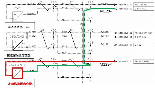 根據(jù)以上電氣原理圖,發(fā)動(dòng)機(jī)機(jī)油壓力感應(yīng)器連接到駕駛室ECU控制器的28針腳(線號(hào)M128)和29針腳(線號(hào)M129),如上圖紅色和綠色線路。用萬用表歐姆檔測(cè)量機(jī)油壓力兩條線路對(duì)地沒有短路,與ECU控制器的插頭也沒有斷路。